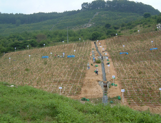 1985年(昭和60年)長野市北部で起こった大規模な地すべりによって、地附山の半分の森が消失しました。この緑を回復するために、周辺の森から拾い集めた広葉樹の種を育て、ポット苗として幼苗植栽を行いました。 今では、防災メモリアル地附山公園を囲む見事な森に育っています。特に秋の紅葉は、長野市内のあちこちから錦織りなす森を眺めることができます。 あと10年で、本当のふるさとの森が完成します。