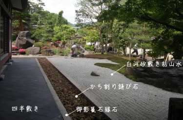 築庭当時(100年前)にもどす改修工事。小さな修繕を行った部分を、綺麗に回復させ、白河砂敷き枯山水の日本庭園の格式を取り戻しました。特に庫裡と庭園の間にある犬走りと雨落の部分にこだわりました。日本庭園の様式に従い、四半敷きを行いました。
