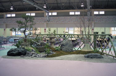選手村の食堂に日本庭園を作りました。信州の故郷をイメージする「わさび」を植えこみました。