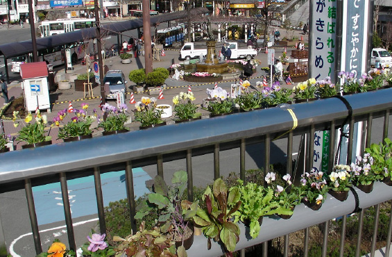 長野駅前の横断陸橋の手すりに、パイプによる緑化を行いました。培養液が循環し、植えられた花はいつまでも元気に育っています。 植物は太陽の光を浴びて光合成を行い、根から養分を吸い上げます。それと同時に、太陽光パネルにも光が当たり電気が生まれます。その電気で培養液を循環させるポンプが動き始めるという仕組みを作りました。自然にできるだけダメージを与えない、環境緑化の一つの成功例です。